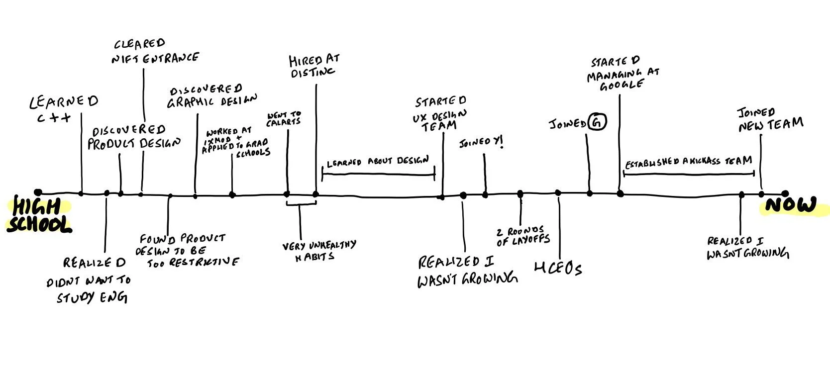 I return after 20 minutes and ask them to walk me through the timeline. For every highlight and lowlight I ask them for the why behind it. For example, why is it a highlight that you won an award? Was it because of the recognition? Or the doors it opened for you? Or got you resources for further projects? etc.